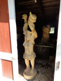 work yard views of carvings in walnut. i haven't decided yet whether to paint these or not, though the base of the female figure with the bird is inscribed "Thou wast not born for death, Immortal Bird!" (a line from Keats's Ode to a Nightingale). each carving is about 30 inches tall. the walnut is very heavy and dense: