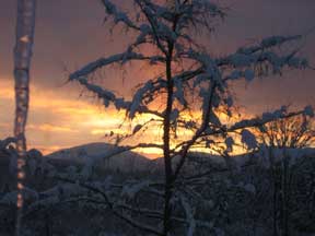 in the distance is the pliny range of the kilkenneys. every sunrise is different, even though it's the same sun, mountains, trees, streams and sky. east lancaster is one of the most beautiful parts of new hampshire, and that's saying something. out these windows i've seen bear, deer, even an ever so shy bobcat. we've listened to squirrels chatter, moose wallow, and coyotes howl. beaver gnaw the saplings along the brooks, otters hop along the banks, snow geese nest on spits of sand, and heron glide silently from fishing hole to fishing hole. i call this area "the shire."